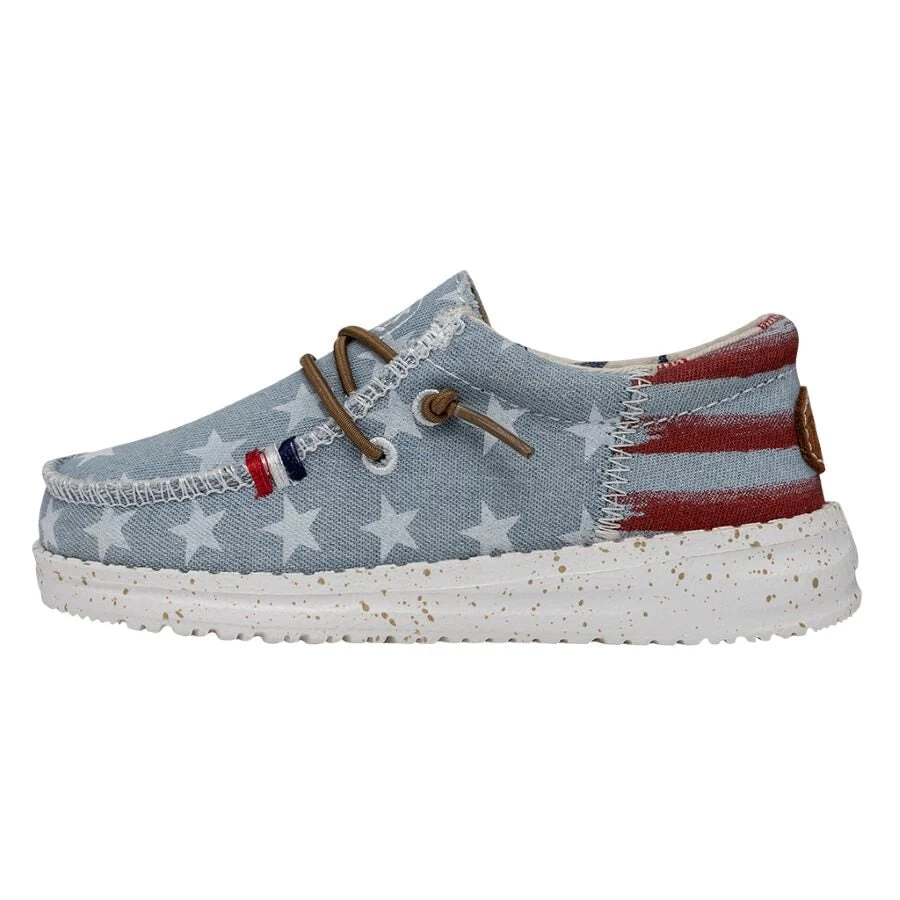 Red, white and true in every step. Introducing the Wally Toddler Americana collection, where strides and pride run loud throughout. Constructed in a breathable, cotton canvas upper and featuring an ultralight outsole with no-tie, elastic laces and a cushioned ankle collar for summer play all season long.